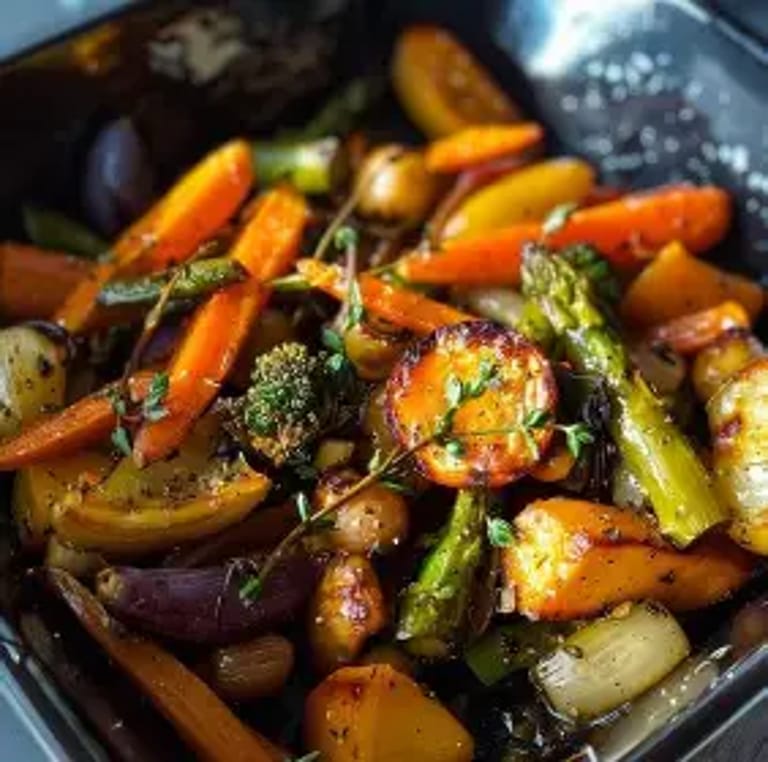Rôtir au four 25–30 min à 200°C jusqu’à ce que les légumes soient tendres et légèrement dorés.